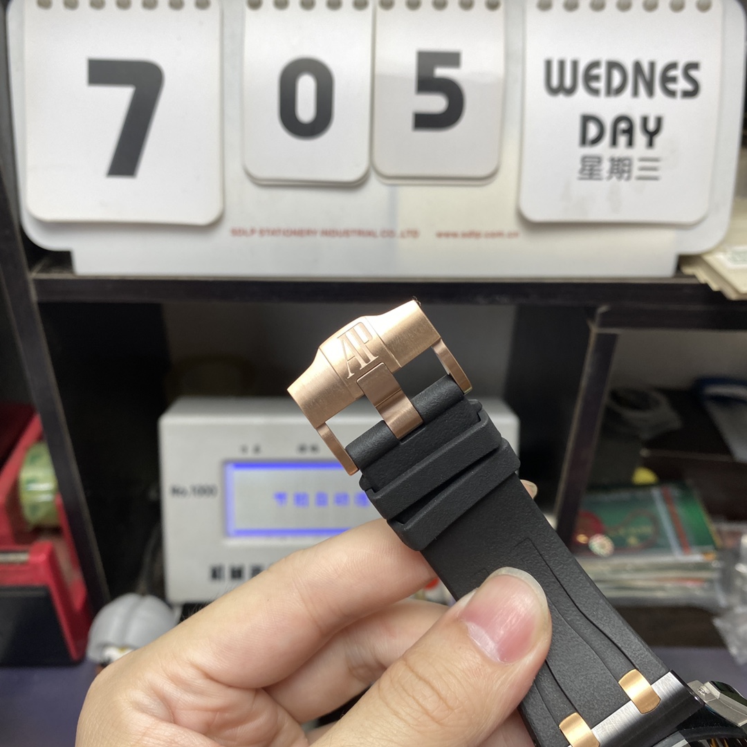 ·Dial Material: Black dial with "Méga Tapisserie" oversized grid decoration, black smoked blue sapphire sub-dials with rose gold sunburst decoration, black outer zone, rose gold luminescent applied hour markers, and Royal Oak hands. Black inner bezel.