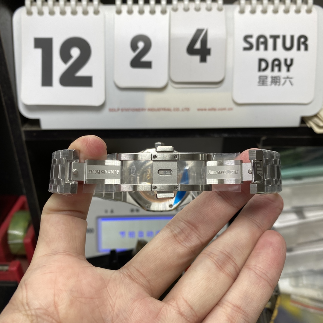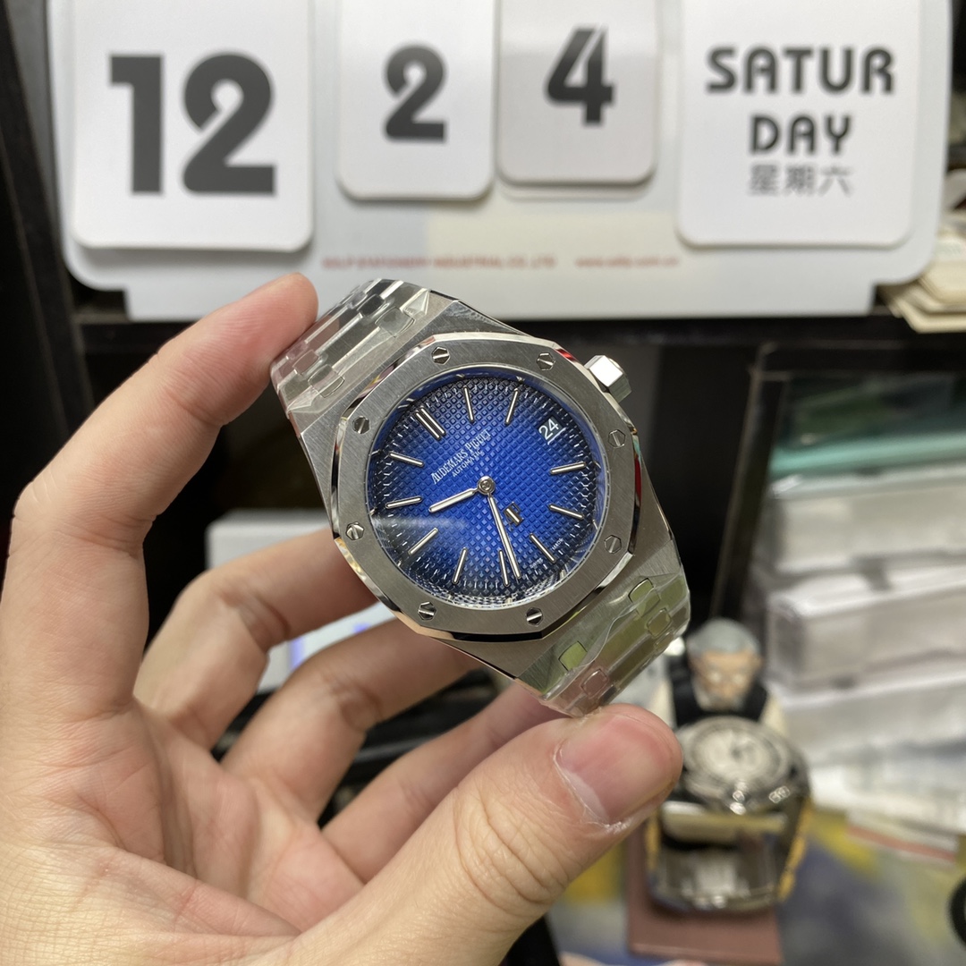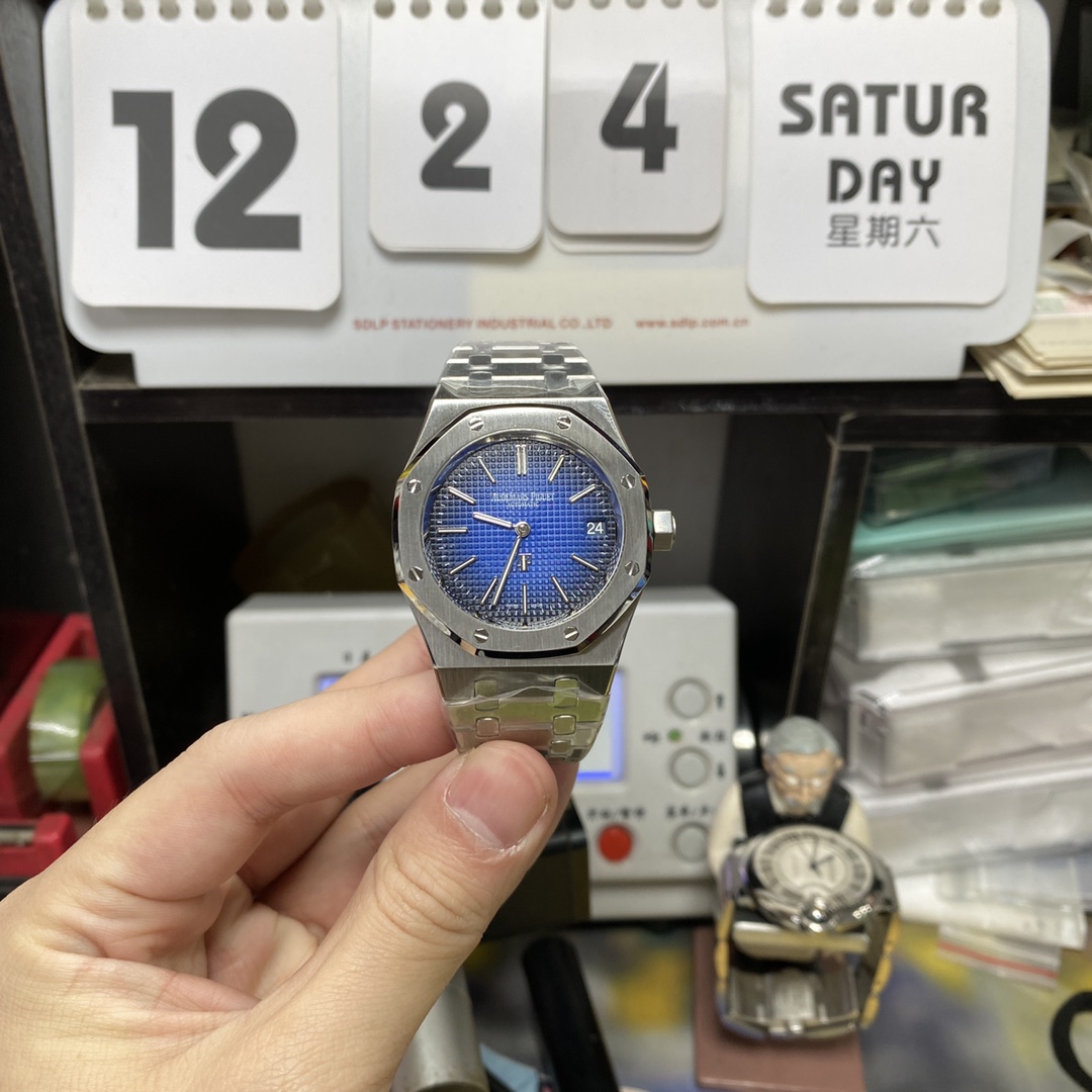 ·Dial Material: Smoked blue dial with "Petite Tapisserie" small checkered decoration, featuring white gold luminescent applied hour-markers and Royal Oak hands