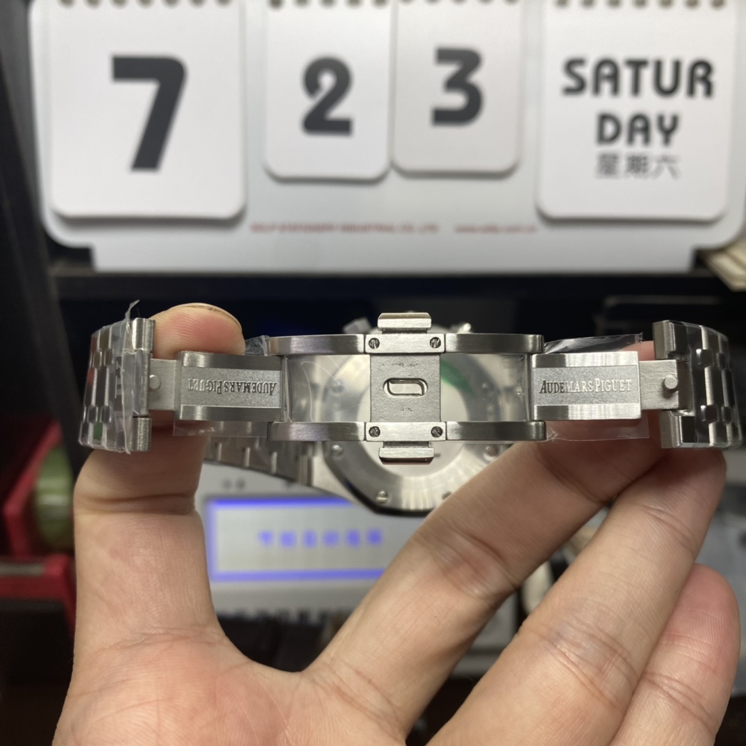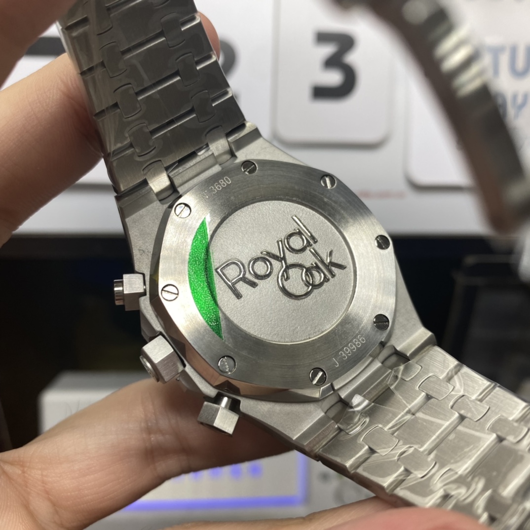 ·Dial Material: Silver dial with "Grande Tapisserie" large grid pattern decoration, featuring a black sub-dial and outer zone, platinum luminescent applied hour markers, and Royal Oak hands