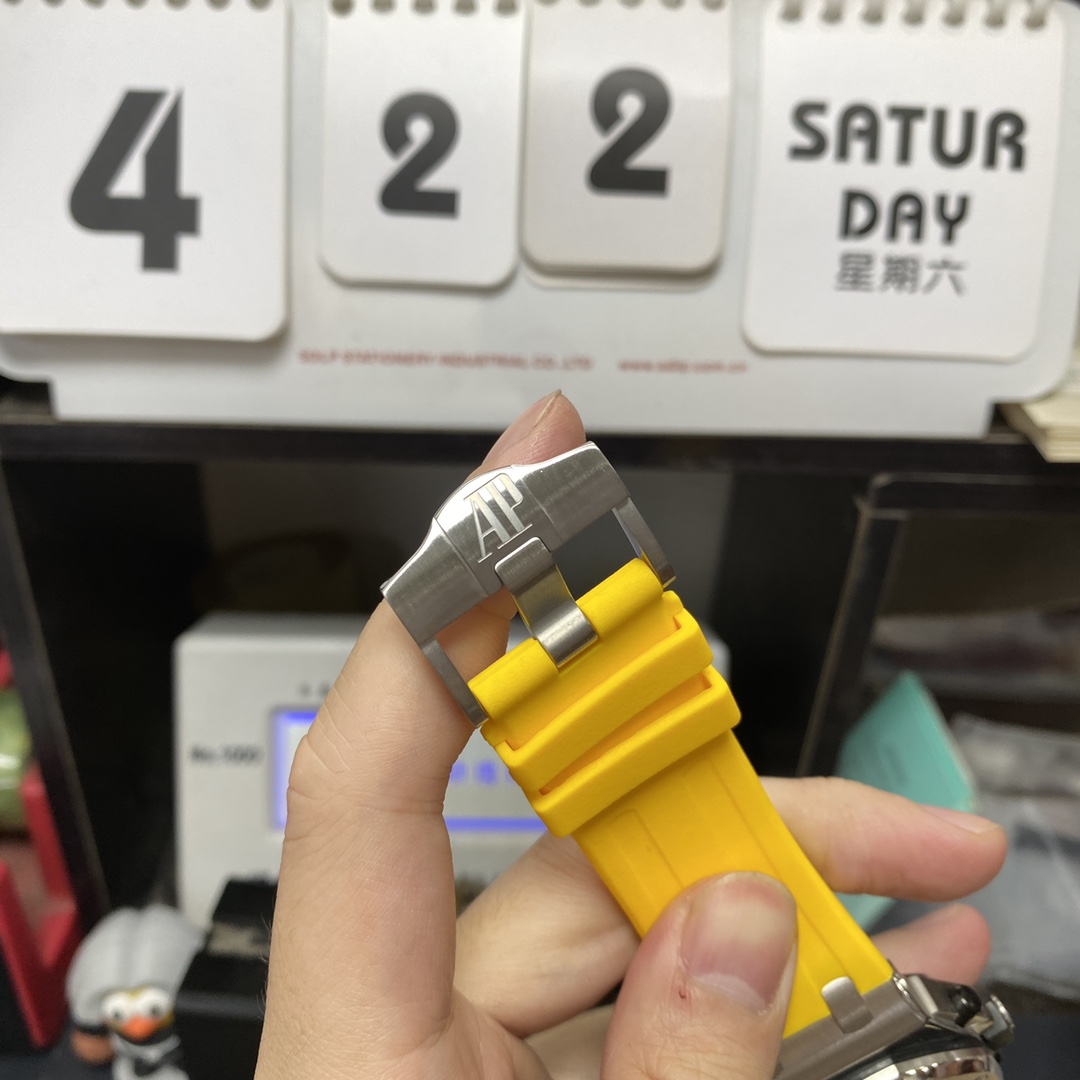 ·Dial Material: Bright Yellow dial with "Méga Tapisserie" oversized pattern, black sub-dials, white gold luminescent hour markers, and Royal Oak hands. Black rotating inner bezel with diving scale and bright yellow 60 to 15-minute zone.