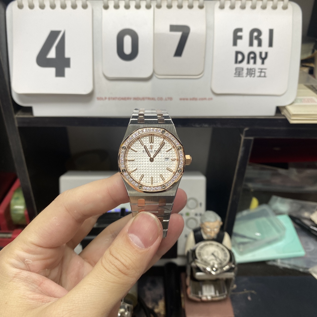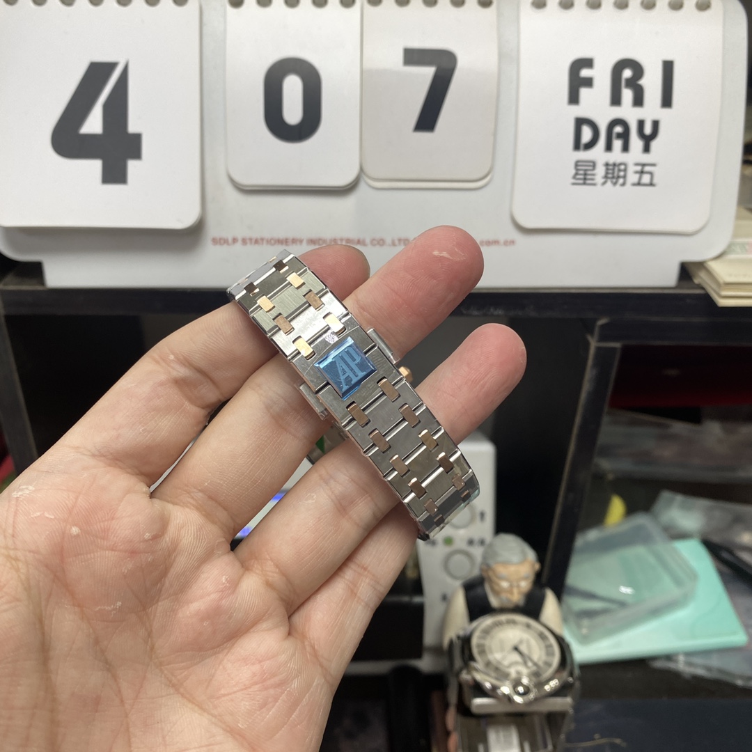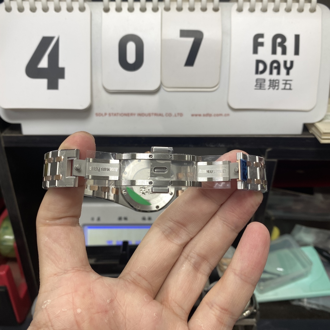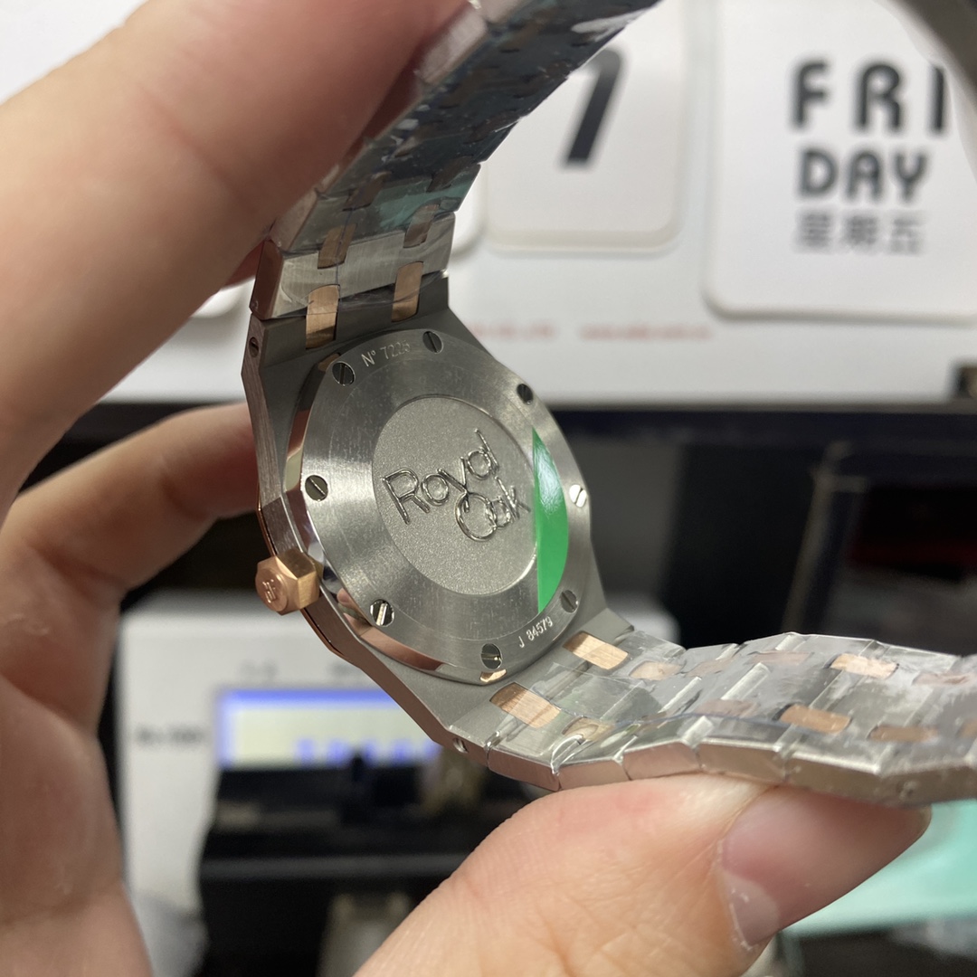 ·Dial Material: Silver dial with a unique "Grande Tapisserie" large square grid pattern, rose gold luminescent embedded hour markers, and Royal Oak hands