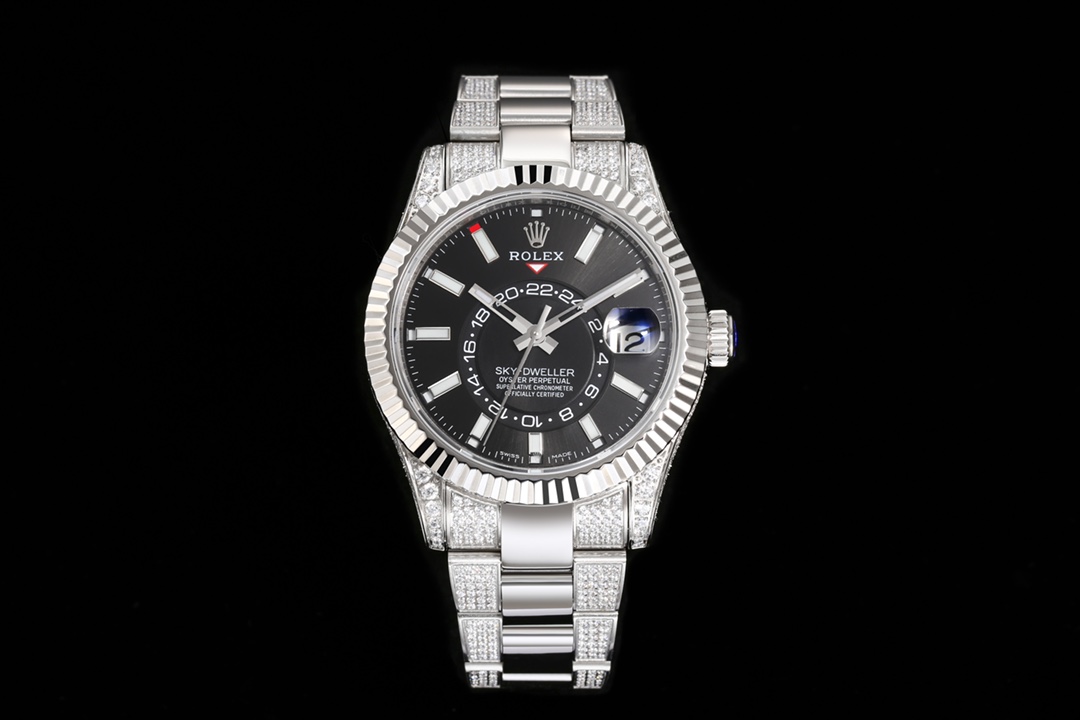 Rolex SKY-DWELLER series Black/BLUE Dial, FULL diamond case, ,Month Date and GMT Dual Time Zone Functions, 42mm Size.